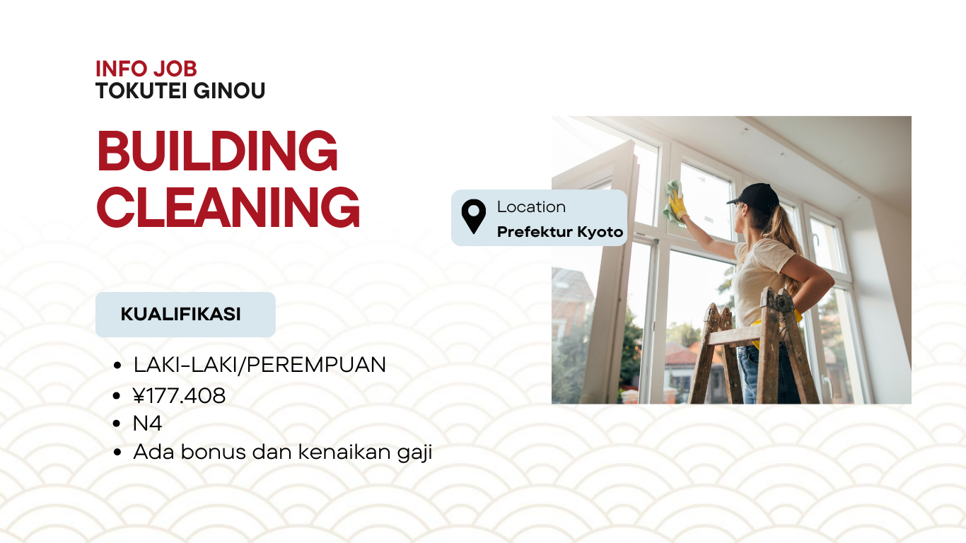 Kami membuka kesempatan bagi Anda yang ingin bekerja di Jepang dalam bidang Building Cleaning melalui visa Tokutei Ginou. Posisi ini cocok bagi tenaga kerja profesional yang ingin mengembangkan karir sekaligus mendapatkan pengalaman kerja di Jepang.