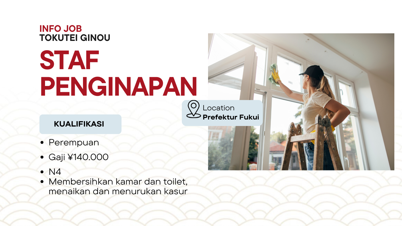 Kami membuka kesempatan bagi Anda yang ingin bekerja di Jepang dalam bidang Industri Penginapan melalui visa Tokutei Ginou. Posisi ini cocok bagi tenaga kerja profesional yang ingin mengembangkan karir sekaligus mendapatkan pengalaman kerja di Jepang.