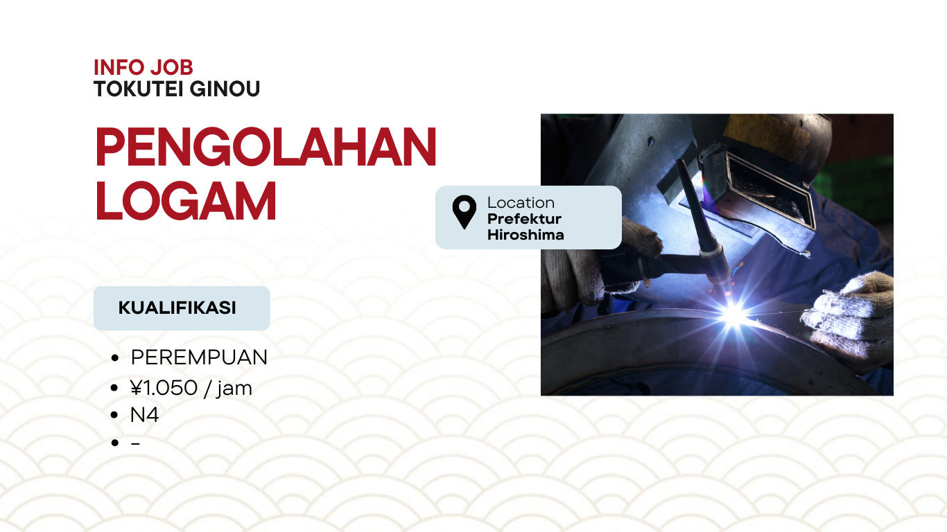 Kami membuka kesempatan bagi Anda yang ingin bekerja di Jepang dalam bidang Pengolahan Logam melalui visa Tokutei Ginou. Posisi ini cocok bagi tenaga kerja profesional yang ingin mengembangkan karir sekaligus mendapatkan pengalaman kerja di Jepang.