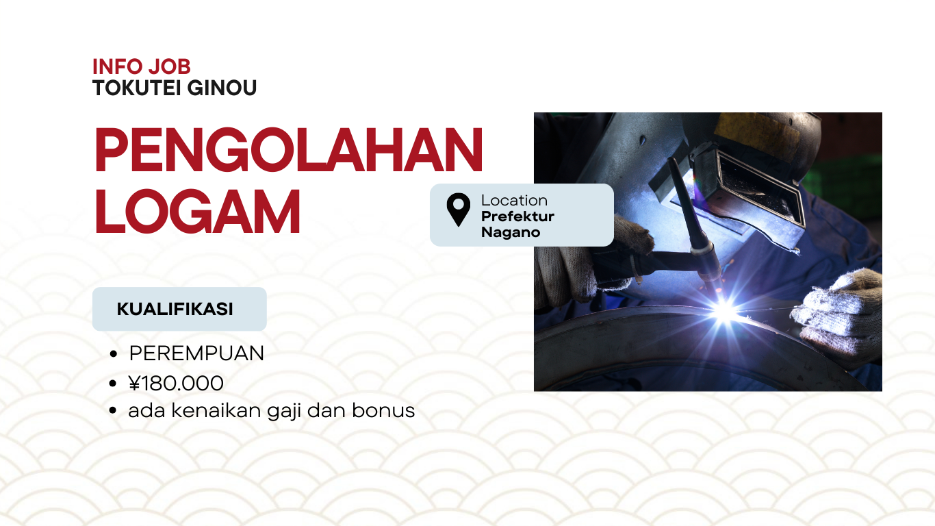 Kami membuka kesempatan bagi Anda yang ingin bekerja di Jepang dalam bidang Pengolahan Logam melalui visa Tokutei Ginou. Posisi ini cocok bagi tenaga kerja profesional yang ingin mengembangkan karir sekaligus mendapatkan pengalaman kerja di Jepang.