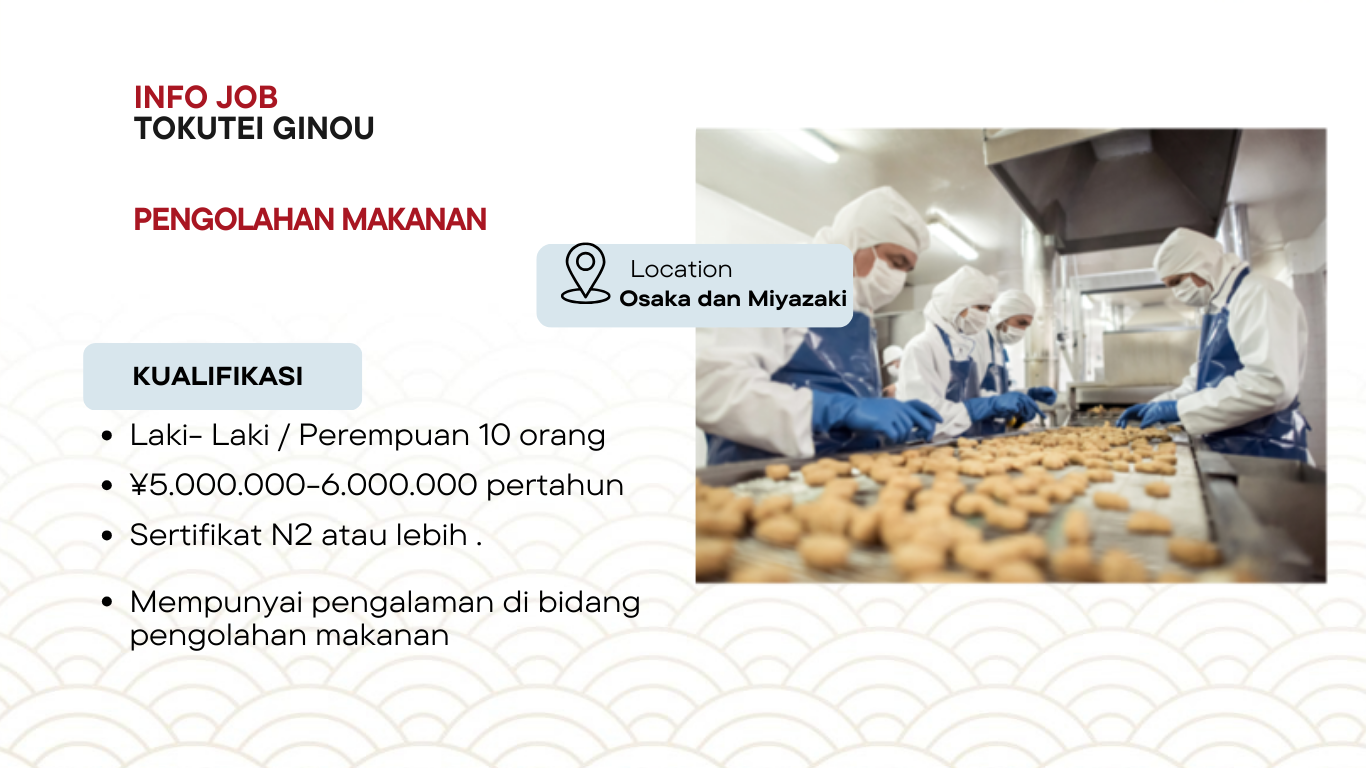 Kami membuka kesempatan bagi Anda yang ingin bekerja di Jepang dalam bidang Pengolahan Makanan melalui visa Tokutei Ginou. Posisi ini cocok bagi tenaga kerja profesional yang ingin mengembangkan karir sekaligus mendapatkan pengalaman kerja di Jepang.
