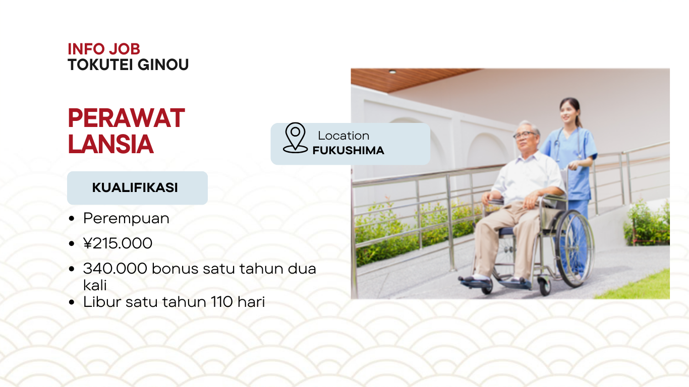 Kami membuka kesempatan bagi Anda yang ingin bekerja di Jepang dalam bidang Perawat Lansia melalui visa Tokutei Ginou. Posisi ini cocok bagi tenaga kerja profesional yang ingin mengembangkan karir sekaligus mendapatkan pengalaman kerja di Jepang.