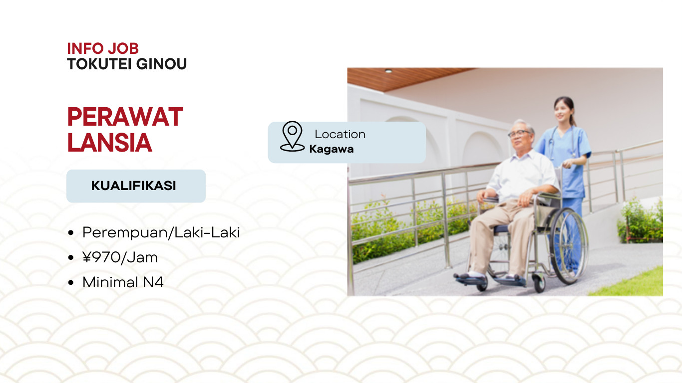 Kami membuka kesempatan bagi Anda yang ingin bekerja di Jepang dalam bidang Perawat Lansia melalui visa Tokutei Ginou. Posisi ini cocok bagi tenaga kerja profesional yang ingin mengembangkan karir sekaligus mendapatkan pengalaman kerja di Jepang.