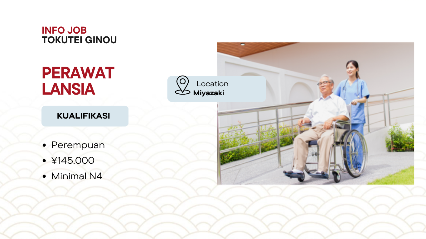 Kami membuka kesempatan bagi Anda yang ingin bekerja di Jepang dalam bidang Perawat Lansia melalui visa Tokutei Ginou. Posisi ini cocok bagi tenaga kerja profesional yang ingin mengembangkan karir sekaligus mendapatkan pengalaman kerja di Jepang.
