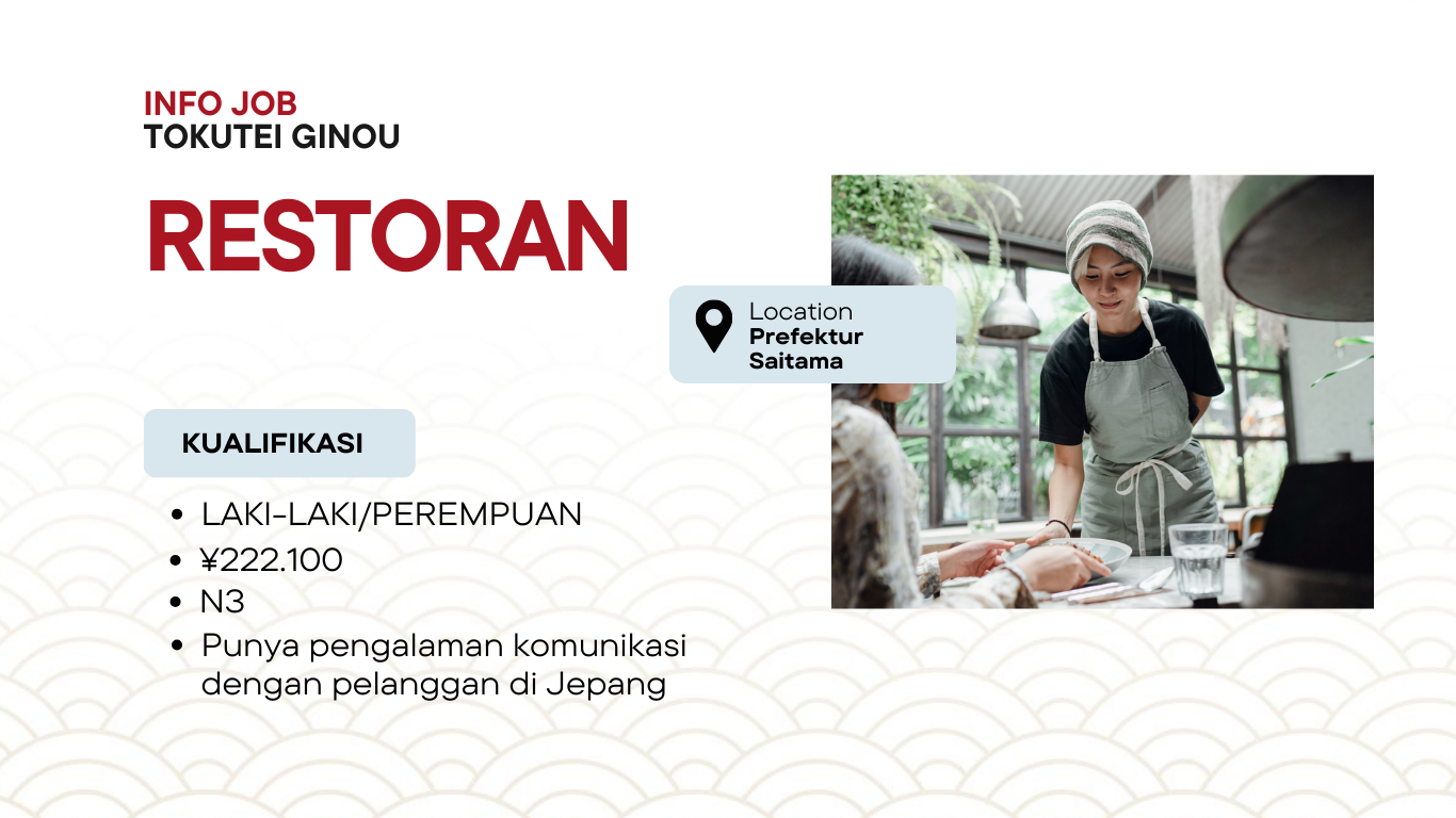 Kami membuka kesempatan bagi Anda yang ingin bekerja di Jepang dalam bidang Restoran melalui visa Tokutei Ginou. Posisi ini cocok bagi tenaga kerja profesional yang ingin mengembangkan karir sekaligus mendapatkan pengalaman kerja di Jepang.