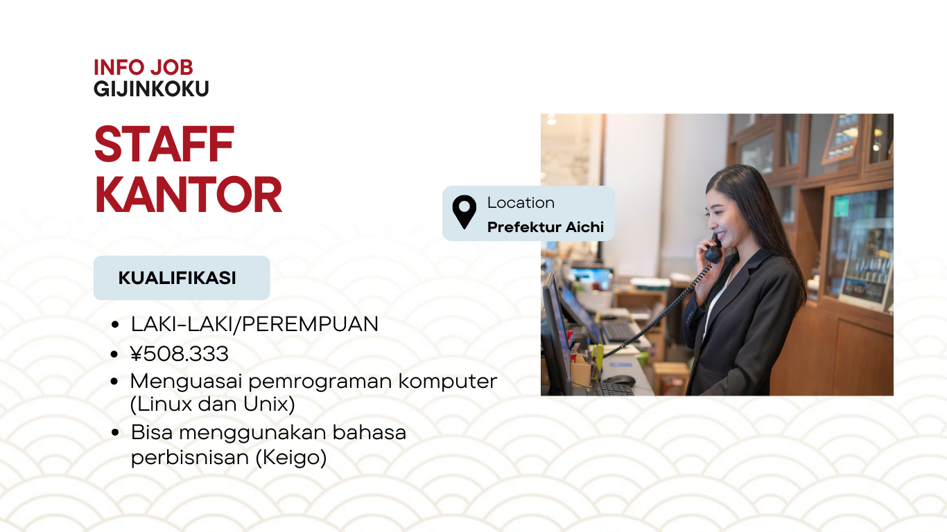 Kami membuka kesempatan bagi Anda yang ingin bekerja di Jepang dalam bidang Staff Kantor melalui visa Gijinkoku. Posisi ini cocok bagi tenaga kerja profesional yang ingin mengembangkan karir sekaligus mendapatkan pengalaman kerja di Jepang.
