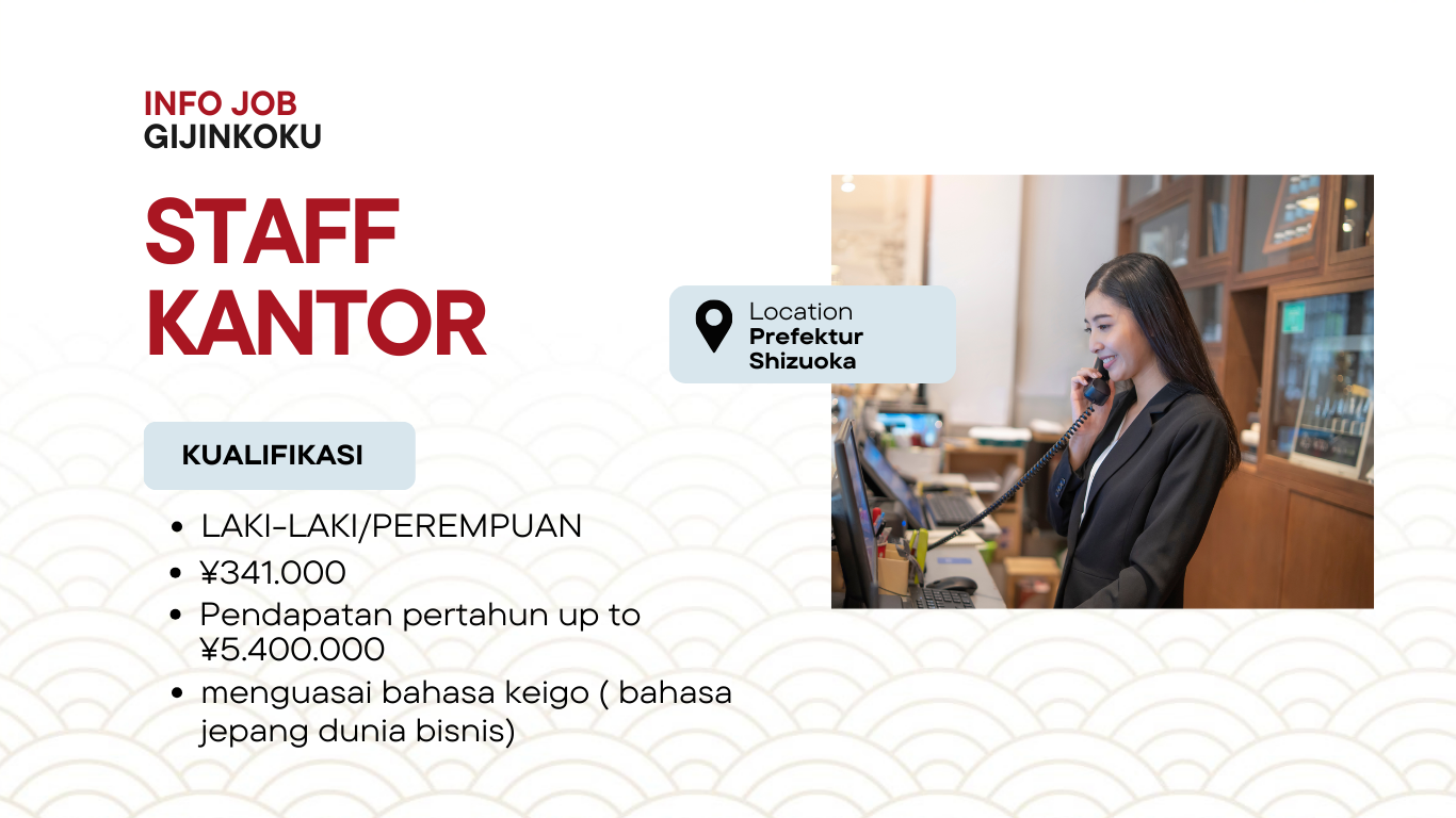 Kami membuka kesempatan bagi Anda yang ingin bekerja di Jepang dalam bidang Staff Kantor melalui visa Gijinkoku. Posisi ini cocok bagi tenaga kerja profesional yang ingin mengembangkan karir sekaligus mendapatkan pengalaman kerja di Jepang.