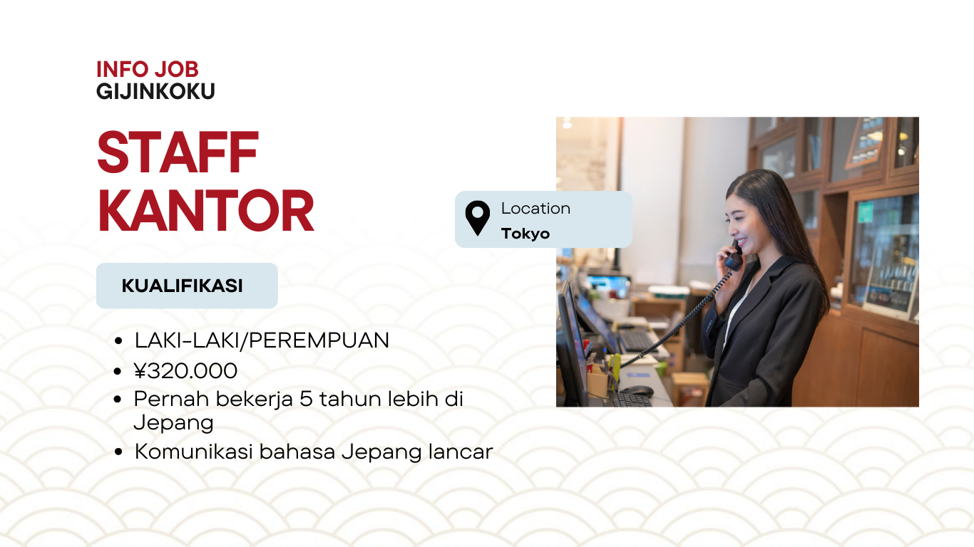 Kami membuka kesempatan bagi Anda yang ingin bekerja di Jepang dalam bidang Staff Kantor melalui visa Gijinkoku. Posisi ini cocok bagi tenaga kerja profesional yang ingin mengembangkan karir sekaligus mendapatkan pengalaman kerja di Jepang.